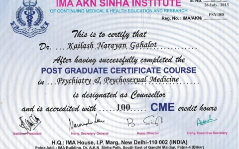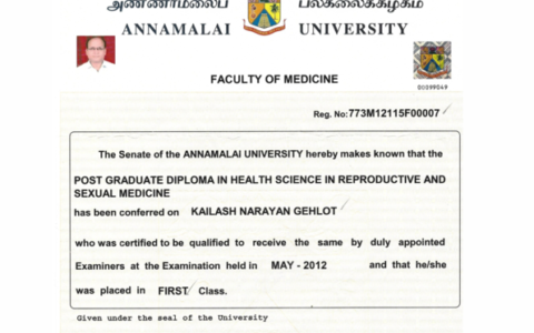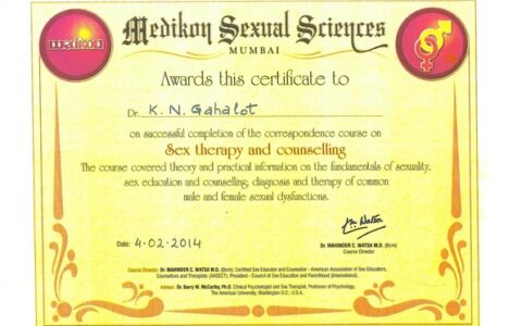 Dr.K.N.Gahalot specializes in the field of sexual medicine and holds a diploma in Reproductive and Sexual Medicine in First Class from the Annamalai University of India in 2012 which is first in Madhya Pradesh.
